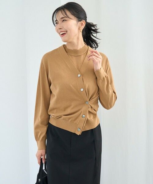 前立てのボタンホールを脇のボタンにずらして留めると、カシュクール風のツイストカーディガンに変化する2WAY仕様。