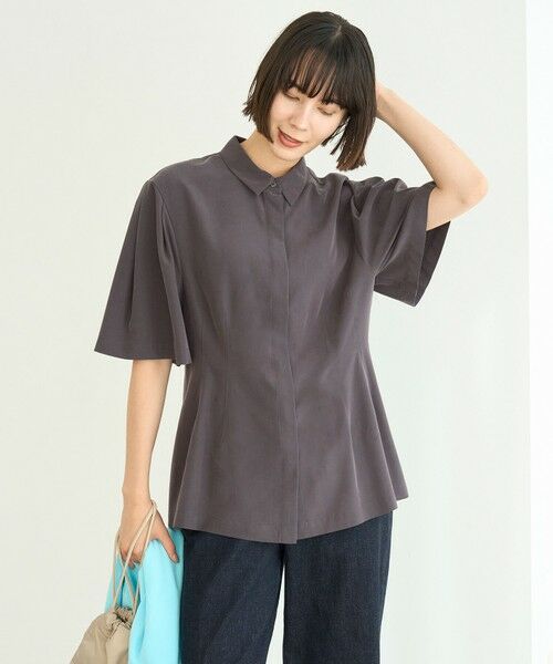 ■デザインメリハリのあるシルエットで、ウエストインしなくても決まるブラウス。ウエストのシェイプされた部分は、窮屈にならないよう裾の分量を出しています。フレアスリーブで、二の腕もさり気なくカバーしてくれます。ウエストのポイントを高めにすることで、スタイルアップ効果も期待できます。スリムなパンツでキレイ目に着こなすのはもちろん、デニムを合わせたカジュアルコーディネートもおすすめです。