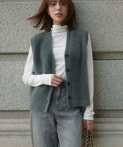 ■デザイン1枚でもサマになり、レイヤードなど幅広くコーディネートで活躍してくれるカーディガンベスト。シャギーの素材感と絶妙なV開きで大人の女性らしい雰囲気を演出します。釦をあけて羽織ったり、前後着用可能な衿あきでクルーベストとしても着用いただけます。