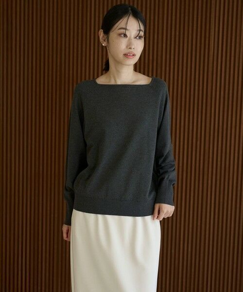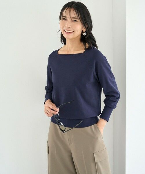 ■デザイン首元があきすぎないスクエアネックで、デコルテラインを美しく見せてくれるネックデザイン。肩の切り替えがないため、肩まわりにゆとりがあり、肩幅を気にせず着用できるラグランスリーブです。程よいサイズ感でリラックス感がありながらも、上品な印象に。1枚で着映えながら、ジャケットのインナーとしてもご着用いただけます。