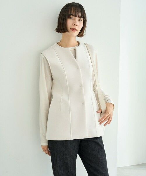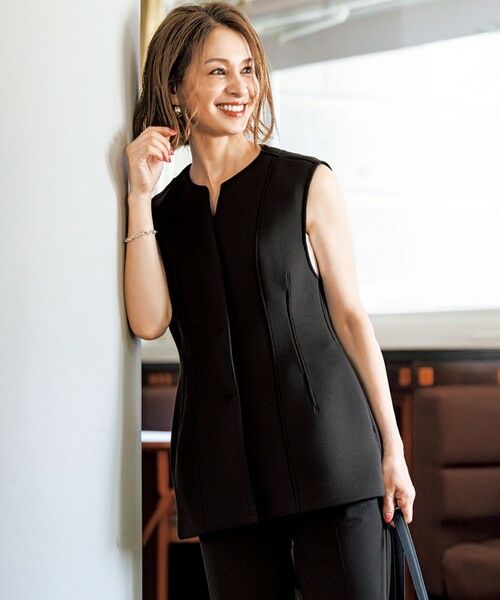 一枚で即こなれ感の叶う、VERYとの最強コラボジレ。ウエストが程よくシェイプされた構築的なシルエットでありながら、裾にかけて身体から離れる立体的なパターンでスタイルアップ効果を期待できるジレです。パネルラインで作る女性らしいしなやかなカーブは360°どこからみても美しいラインを演出します。フロントのキーネック効果で顔周りもすっきりと。気になるヒップ回りも自然にカバーしてくれる丈感なので、安心してご着用いただけます。広めのアームホールで、インナーを選ばずレイヤードスタイルをお楽しみいただけます。真夏はトップス感覚で、秋にはブラウスとレイヤード、と一枚でロングシーズン活躍してくれる着回し力の高いアイテムです。