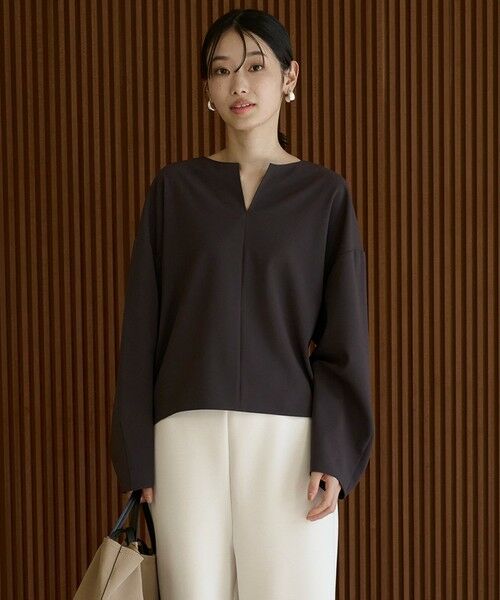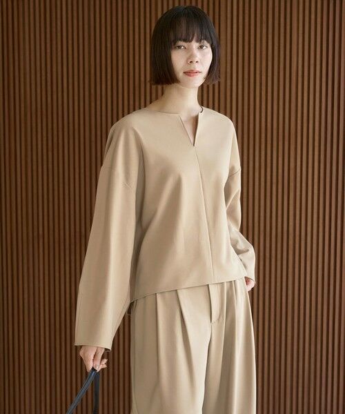 ■デザイン顔まわりをシャープに見せるキーネックデザインのプルオーバー。ゆったりとしたコクーンシルエットがニュアンスのある着こなしを叶えます。やや短めで後ろ下がりのテールデザインだから、タックインしなくてもバランスよく決まるのが魅力。ワイドボトムはもちろん、スラックスなどのきれいめボトムとも好相性で、オンオフ問わず活躍します。さらにタートルネックのインナーやニットを重ねれば、肌寒い季節までロングシーズン楽しめます。