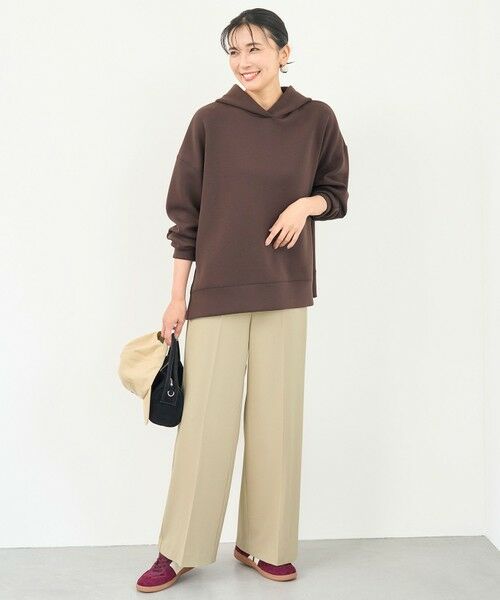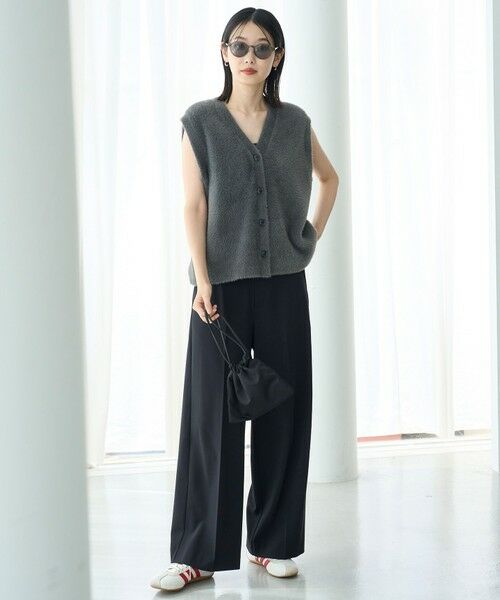 ■デザインオンオフ問わず活躍する、きれいめワイドストレートパンツ。腰から裾までまっすぐ落ちる程よいワイドシルエットと、センタープレスで縦のラインを強調し、はくだけで美脚見えを叶えます。高めに配置した後ろポケットがヒップ位置を引き上げ、バックスタイルまですっきり。後ろウエストはゴム仕様で、きれい見えとラクなはき心地を両立しました。