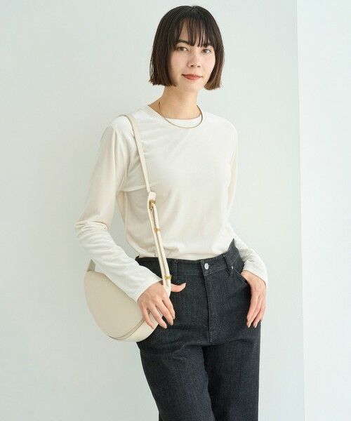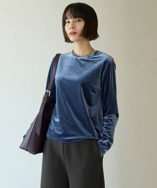■デザインベロア特有の表情感や微光沢な見え感が目を引く、上品見えするベーシックロンTです。身体のラインを拾いすぎない絶妙なサイズ感や少し長めの袖はレイヤード使いにもおすすめです。上品なクルーネックラインなど、シンプルながらも美しいシルエットにこだわった1枚です。袖周りや後ろ中心のステッチもポイントです。
