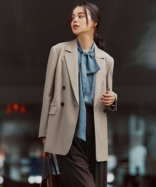 ■デザイン普段使いからオンシーンまで活躍するダブルブレストジャケット。ウール調の上品な素材感に、程よいゆとりのボクシーシルエットでマニッシュな印象に仕上げています。肩パットをあえて付けず、かっちりしすぎない着用感も魅力です。すっきりとした素材のスラックスや、ツヤのスカートなどを合わせると、大人感をグッと引き上げます。お仕事にはもちろん、デニム合わせでカジュアルな装いにもお使いいただけます。