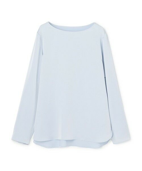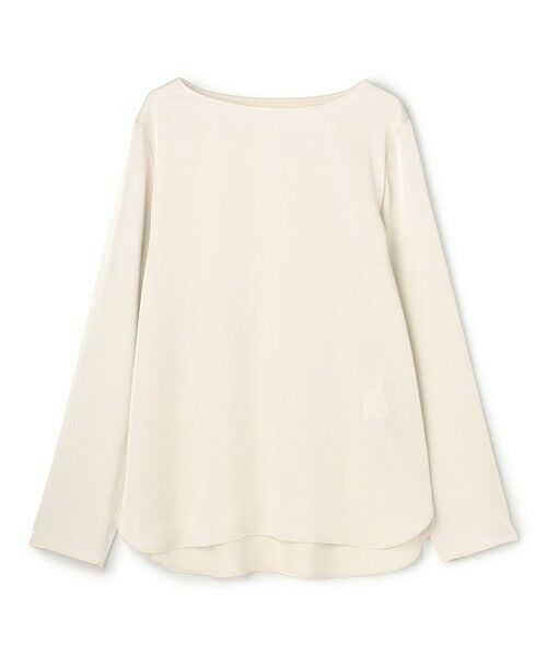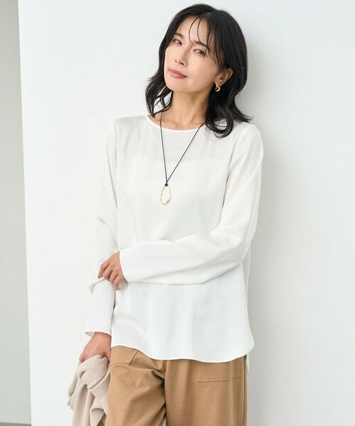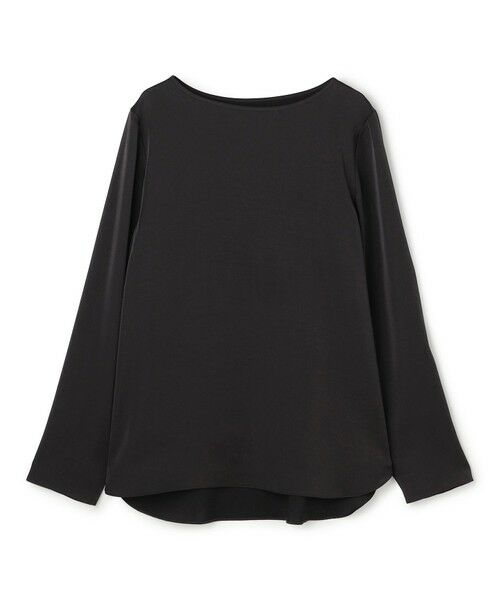■デザイン上品なサテン素材の、大人のシンプルTブラウス。裾をラウンドさせたゆったりシルエットに、デコルテをきれいに見せる緩やかなボートネックが、シンプルながらサマになるデザインです。1枚でさらりと着こなすのはもちろん、ニットやスウェットのインナーとしても活躍します。長めのお袖は、レイヤードスタイルで袖口から自然とのぞくバランスに仕上げています。今シーズンは着丈を少し長く、シャツテールデザインにしているので、よりレイヤードスタイルを華やかに見せてくれます。