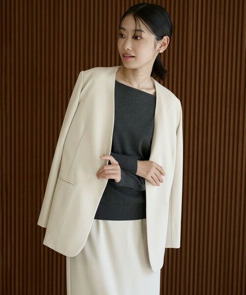 ■デザインデイリーに着まわせる肩の凝らないノーカラージャケット。着心地のよさはもちろん、お仕事やデイリーでも着られる美しさと機能性を備えた1枚です。襟がなくすっきりとした見た目が上品な抜け感を出してくれ、どんなアイテムとも相性良く着用いただけます。裏地のない1枚仕立てなので春から初夏には上着として、秋冬にはコートの下でも軽やかに着られ、季節をまたいでオールシーズン着用でき重宝する一枚です。BEAUTY MOVEシリーズのアイテムとのセットアップ着用が可能です。※既存のノーカラージャケット(JKURSW0702)と比較してレングスが約7長く、身幅も広めに設計しており、よりゆとりを持って着ていただけるデザインです。さらにボタン付きで使い勝手が良いのもポイントです。