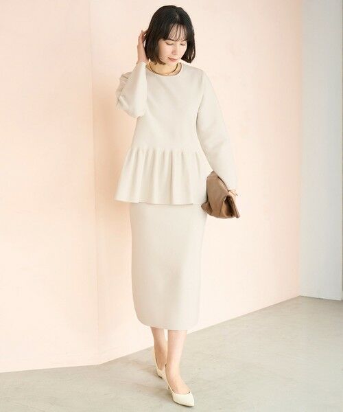■デザインギャザーをたっぷり寄せたペプラムトップスに、同素材のIラインスカートを合わせたニットセットアップ。単品でも着映えるペプラムトップスは、スタイルアップ効果と体型カバーを叶えるデザインです。後ろ衿にあしらったパールボタンが、華やかさをプラスします。合わせるアイテム次第で、きれい目にもカジュアルにも雰囲気を変えてご着用いただけます。※トップスとスカートは同素材を使用しておりますが、編地の向きが違うため、光の当たり具合により色差を感じる場合がございます。