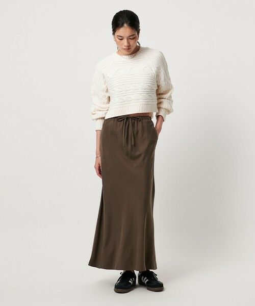 上品な艶と肌触りの良い素材を使い、広がりすぎないフレアシルエットに仕上げたマキシ丈スカート。