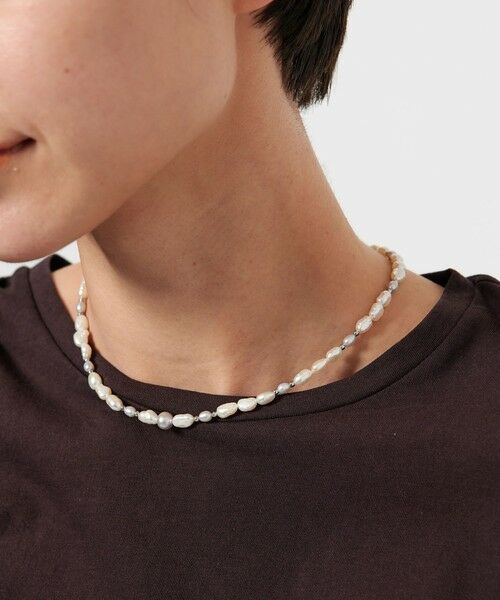 2色の淡水パールにシルバーカラーのパーツを組み合わせた、モード感をプラスするネックレス。