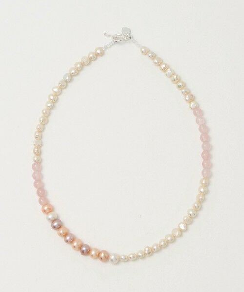淡水パールにローズクォーツなどを加え、柔らかな色合いで仕上げたフェミニンなネックレス。