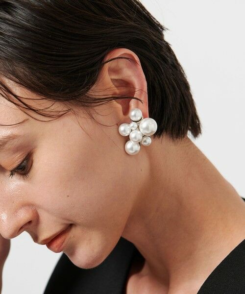 大小のイミテーションパールを立体的に配したことで、上品かつモードな雰囲気を併せ持つイヤリングに。