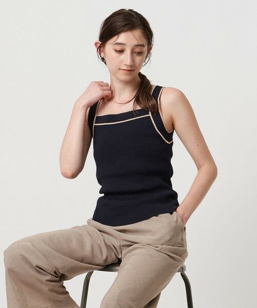 襟ぐりの配色ラインのデザインが目をひく、ニットキャミソール。
