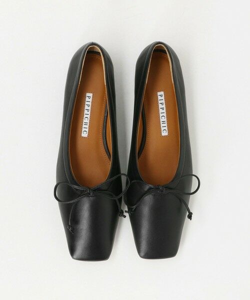 スクエアトゥでシャープさがありつつ、深めのアッパーにあしらったリボンがさりげない可憐さをプラス。