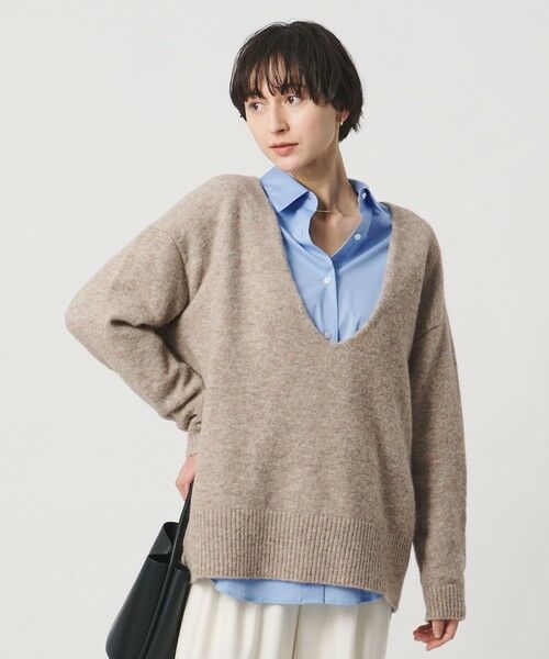 インナーとのレイヤードが映える、深めのVネックデザインのニット。