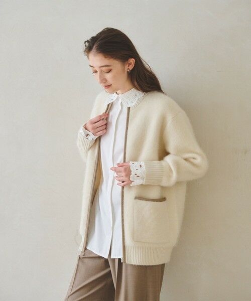 アウター見えする異素材コンビのニット羽織り。