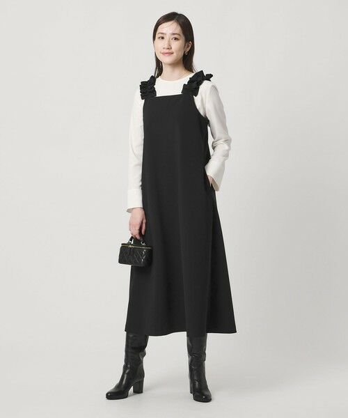 インナーにはフィット感のあるカットソーやリブニットを合わせると、肩紐のフリルが際立ちすっきりとしたフェミニンな印象に。