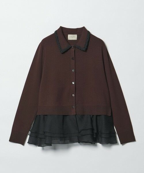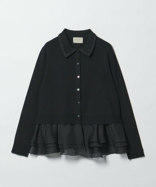 裾周りにあしらった3段ラッフルフリルと、襟元のかぎ針テープが目を惹く、華やかで品のある襟付きニットトップス。