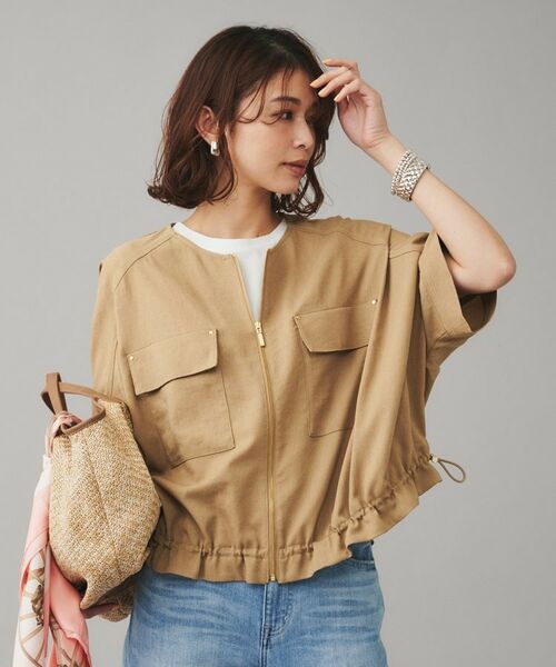 ノーカラーは首元をすっきりと見せ、裾はドロスト仕様でシルエットの変化が楽しめます。