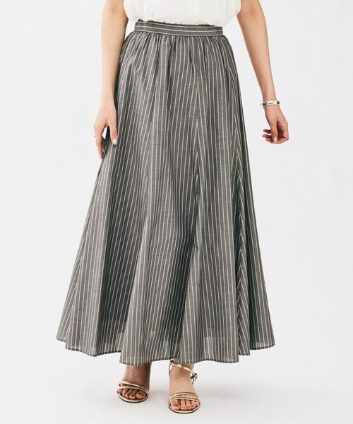 合わせやすい細いストライプ柄なので、同素材のブラウスとセットアップでの合わせだけではなく、無地のニットやカットソーとも相性が良いボトムです。