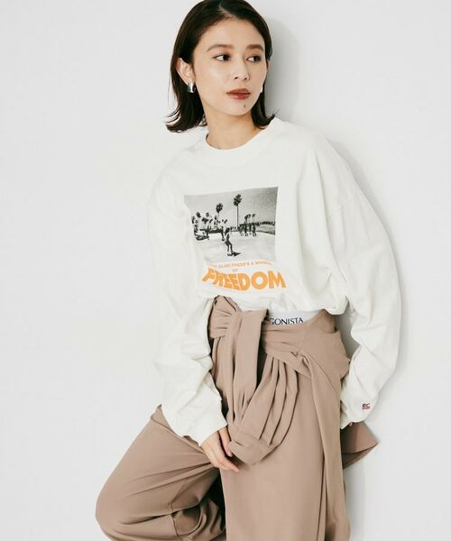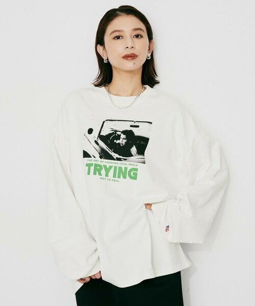 モノトーンフォトと発色の良いメッセージを組み合わせたデザインが遊び心満載なロングスリーブTシャツ。