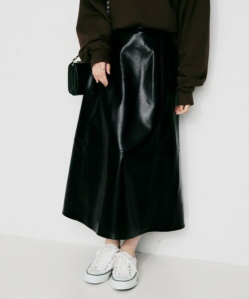 スムースな質感と軽い仕上がりが特徴のレザー調を使用した台形シルエットのスカート。