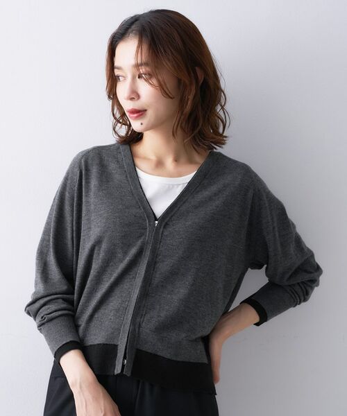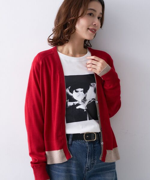 シンプルながらも配色デザインが印象的な天竺編みのカーディガン。