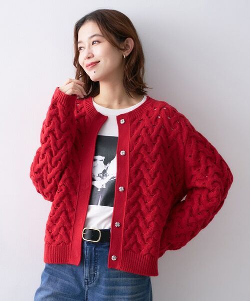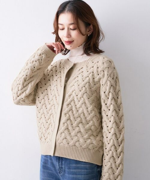 立体的な編地が印象的なカーディガンは、シンプルながら個性的な存在感を放ちます。