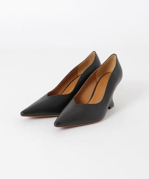長めのノーズのポインテッドトゥにVカットとサイドを湾曲させたシルエットでモード感のあるデザイン。