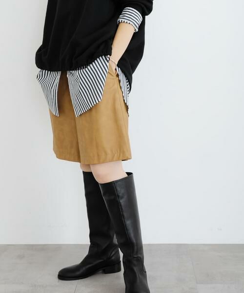 しっとりとした風合いのフェイクレザーを使用したハーフパンツ。マットで表面にムラ感のある素材です。