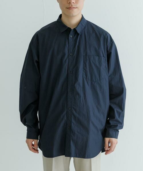 古着の3XLのシャツをベースに作成した、オーバーサイズシルエットのシャツです。製品で特殊なタンブラー乾燥を施した、洗いざらしのような雰囲気が特徴です。ドレスシャツ工場で、美しく見える仕上げにこだわりながら、ステッチはあえて環縫いを採用し、ダンガリーシャツのように仕上げています。タンブラー乾燥かけても縮まず、何度でも心地よいシワ感とドライなタッチが復元します。