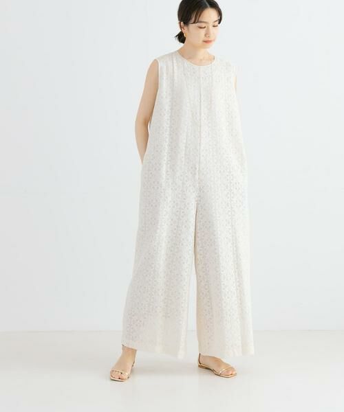 トーションレースのスクエア柄がナチュラルな素材感にシャープさをプラスし、甘さを抑えた上品な印象のオールインワン。