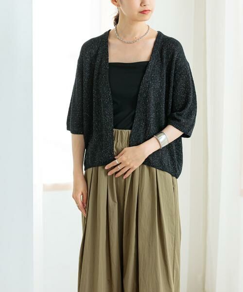 薄手のブークレ素材にラメ糸を一緒に編み込んだニットカーディガンを、ボトムスとバランスの取りやすいショート丈でご用意しました。