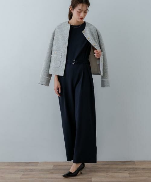 ツイードノーカラージャケット(URA4-27C002 )や、同素材のノーカラージャケット(URA4-27C003 )を合わせてオケージョンスタイルに。