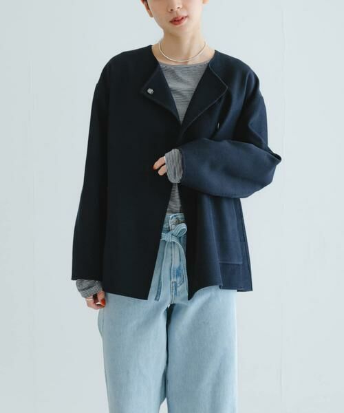首元はすっきりとしたノーカラーデザインに仕上げ、袖はコクーンのように丸みを持たせることで着用時のシルエットが目を惹きます。