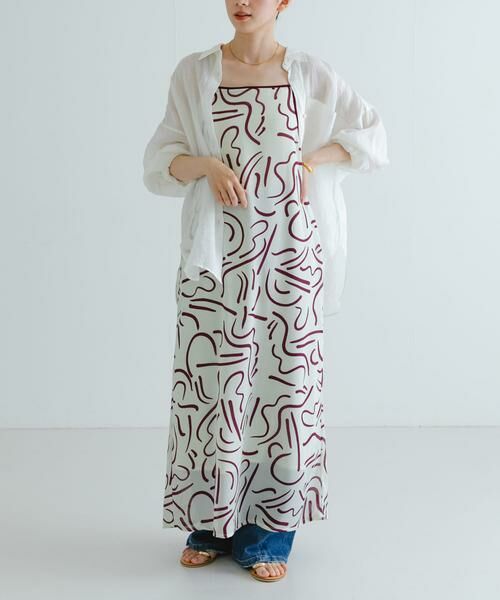 無造作に作られた曲線画をそのまま生地にのせた、アーティスティックな柄が特徴のワンピース。衿ぐりから肩紐の配色パイピングをデザインポイントに加えています。