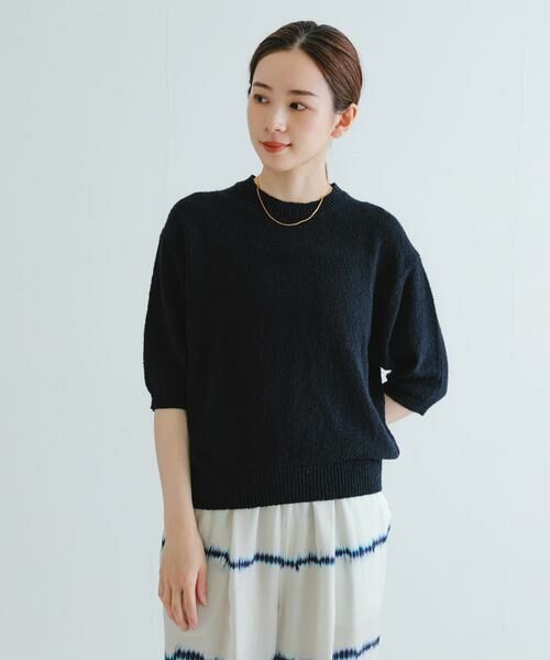 柔らかく、肌触りの良い綿ブークレ素材のハーフスリーブニット。
