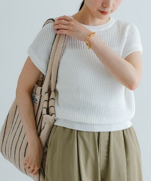 二の腕をカバーしてくれるフレンチスリーブと、好みの位置で丈感を変えられる裾のリブがポイント。ハイウエストのボトムスに合わせてリブを腰より少し上にすると、スタイルアップが叶います。