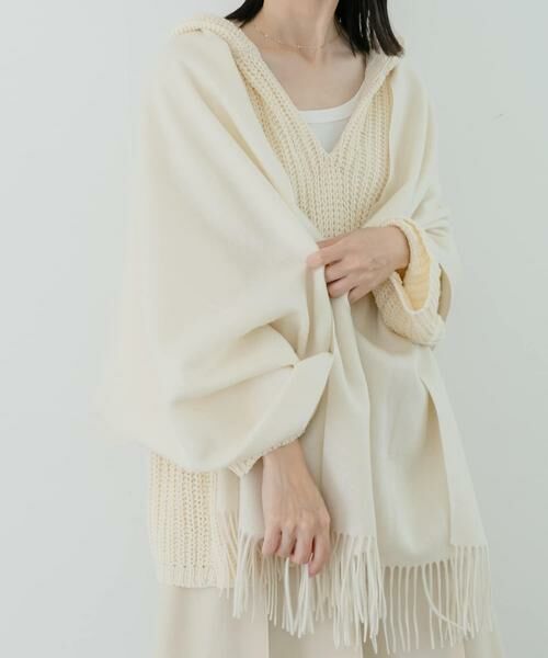 長さのある大判のデザインがクルクルと巻いたり、そのまま肩やブランケットのように膝に掛けたりとマルチに活躍します。