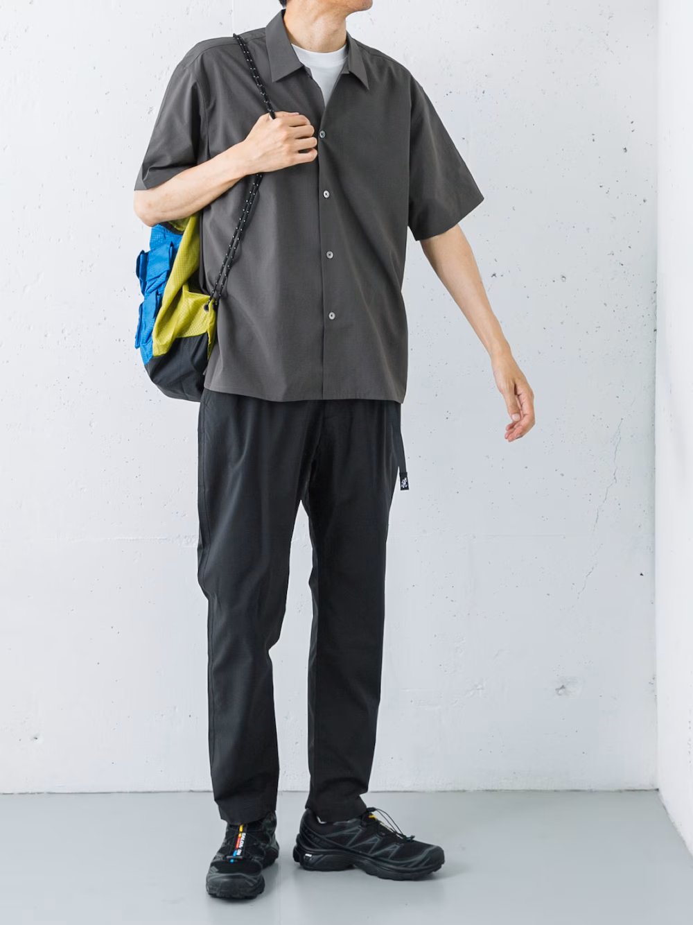 BROAD FUNCTION SHIRTSにGramicci MINOTECH STRETCH PANTSを合わせ、SALOMON XT-6で足元にスポーティな要素を加えます。