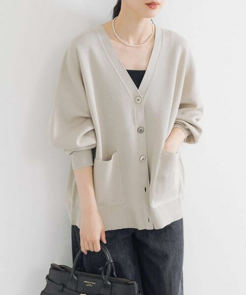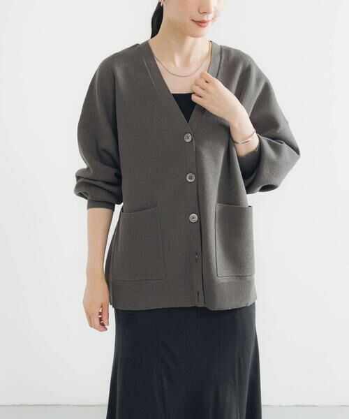 ゆったりとしたオーバーシルエットとドロップショルダーが、着るだけでこなれ感を演出。深すぎないVネックは顔周りをすっきりと見せ、女性らしい印象に。フロントボタンと大きめのパッチポケット、長めの袖口リブがデザインのポイントです。