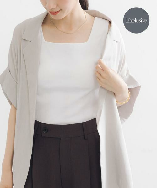 スクエアネックはジャケットやシャツのインナーとしても映え、すっきりとした首元を演出します。春夏にはハーフスリーブジャケット、秋口にはブルゾンやスエード素材のシャツと合わせるなど、ロングシーズン着こなしを楽しめるアイテムです。