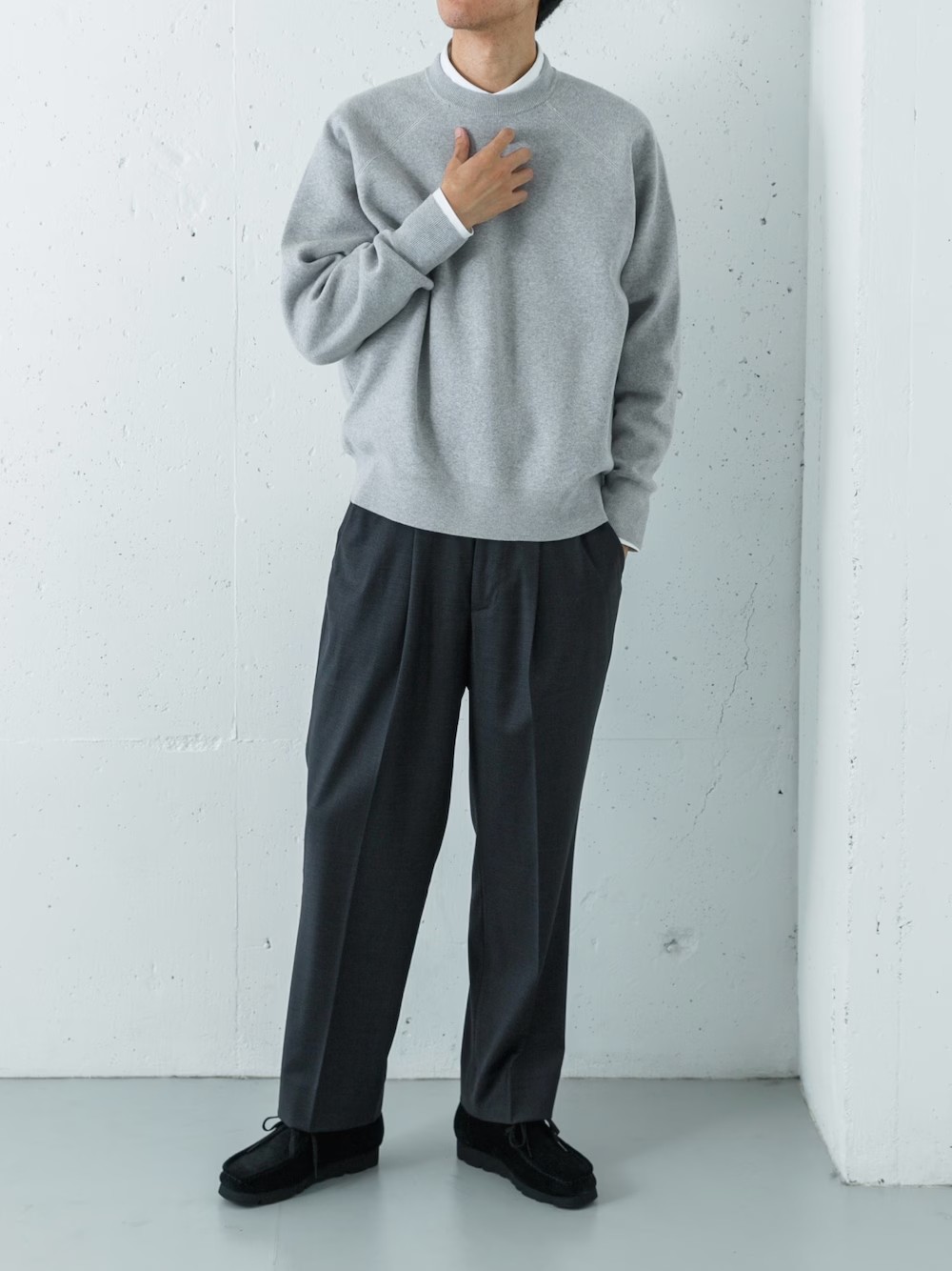 柔らかな風合いのスウェットニットに、上品なシャツをレイヤードしたクリーンなスタイル。 上質なスラックスを合わせることで、リラックス感の中にもきちんと感を持たせています。