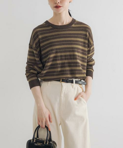 ドライタッチな素材感が心地よい、マルチボーダーのクルーネックニット。