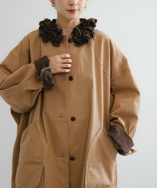 ヴィンテージのハンティングジャケットを再解釈した大きなシルエットに、crinkle crinkle crinkleらしいフリルネックのファンシーさとワークウエアの要素を取り入れ、印象的なスタイルに仕上げました。
