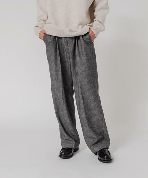トラディショナルなヘリンボーン柄と、現代的なリラックス感を持つワイドシルエットが融合した、クラシカルなスラックスです。