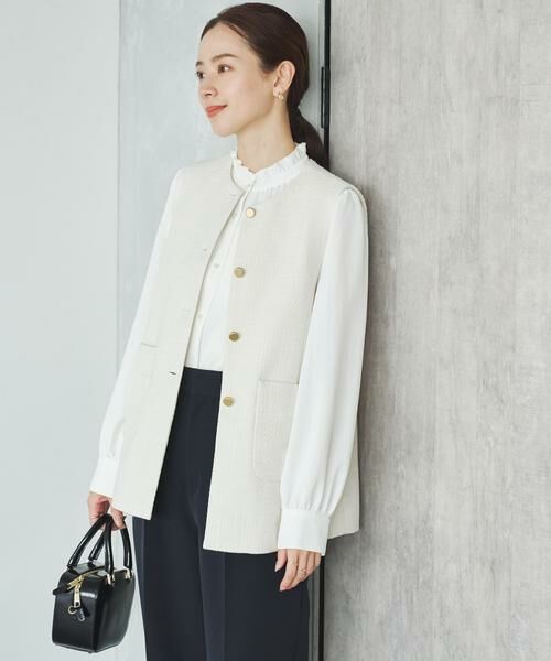 表面感のあるミックスツイード素材を使用した、大人の女性にふさわしい上品な雰囲気を感じさせるジレです。単色のツイード生地なので合わせやすく、様々なインナーと好相性。