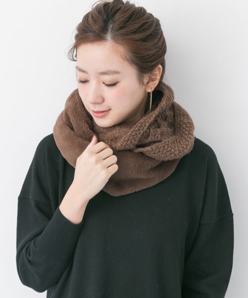 ふわふわの手触りが気持ち良いファー素材と、女性らしい印象をあたえるケーブル編みデザインのニット素材が組み合わさったスヌード。巻き方ひとつで印象が変わる嬉しいアイテムです。