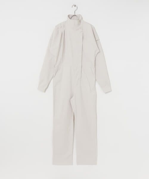 フロントのアシメントリーにデザインされたタックがポイントになるジャンプスーツ。