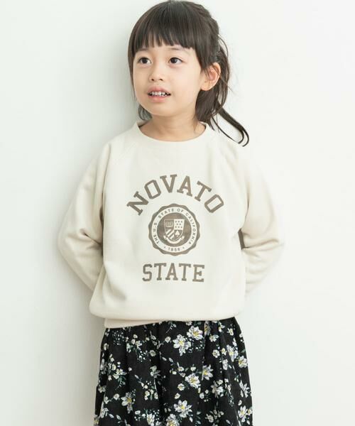 フロッキープリント加工された、カレッジエンブレム風ロゴが可愛いスウェット。
